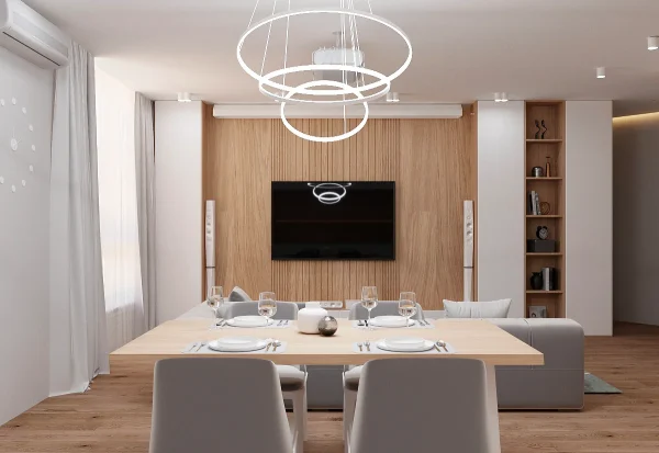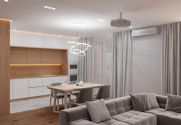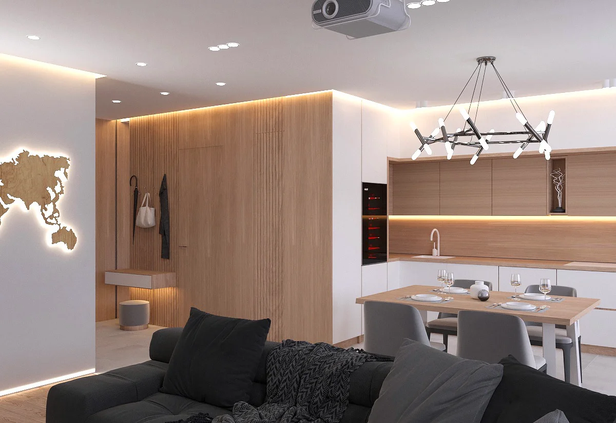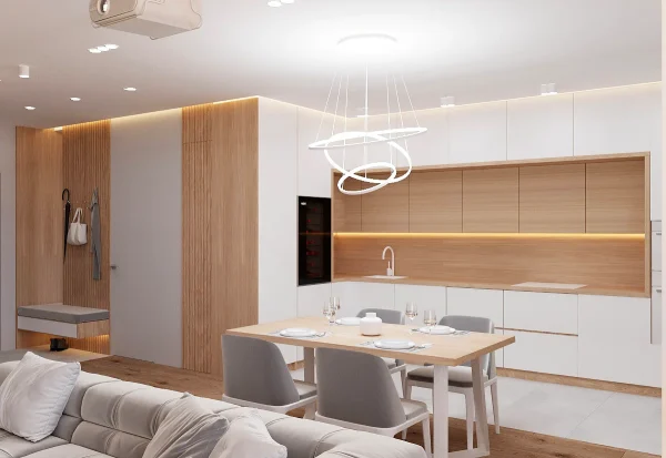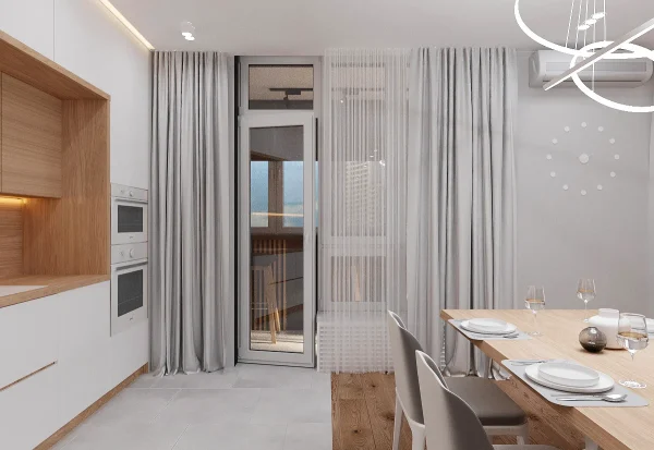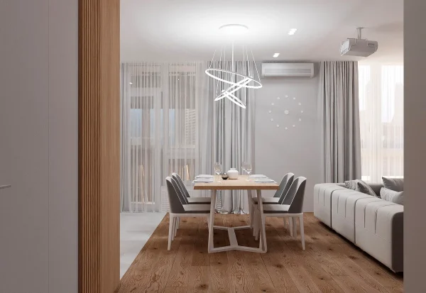 Дизайн проекта квартиры площадью 49,9 м² создан в светлых пастельных тонах, придающих простору легкости и уюта. Квартира имеет функциональную планировку: просторная кухня-гостиная для совместного отдыха, уютная спальня, гардеробная комната для удобного хранения вещей, современный санузел и стильная прихожая. Светлые оттенки в интерьере подчеркивают простор, а продуманное зонирование делает квартиру идеальной для комфортной жизни.