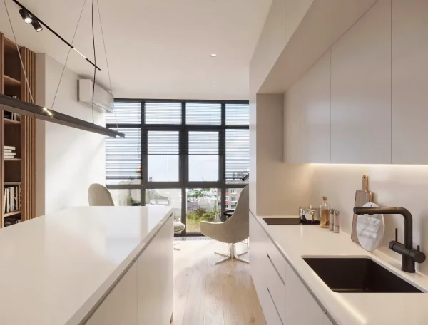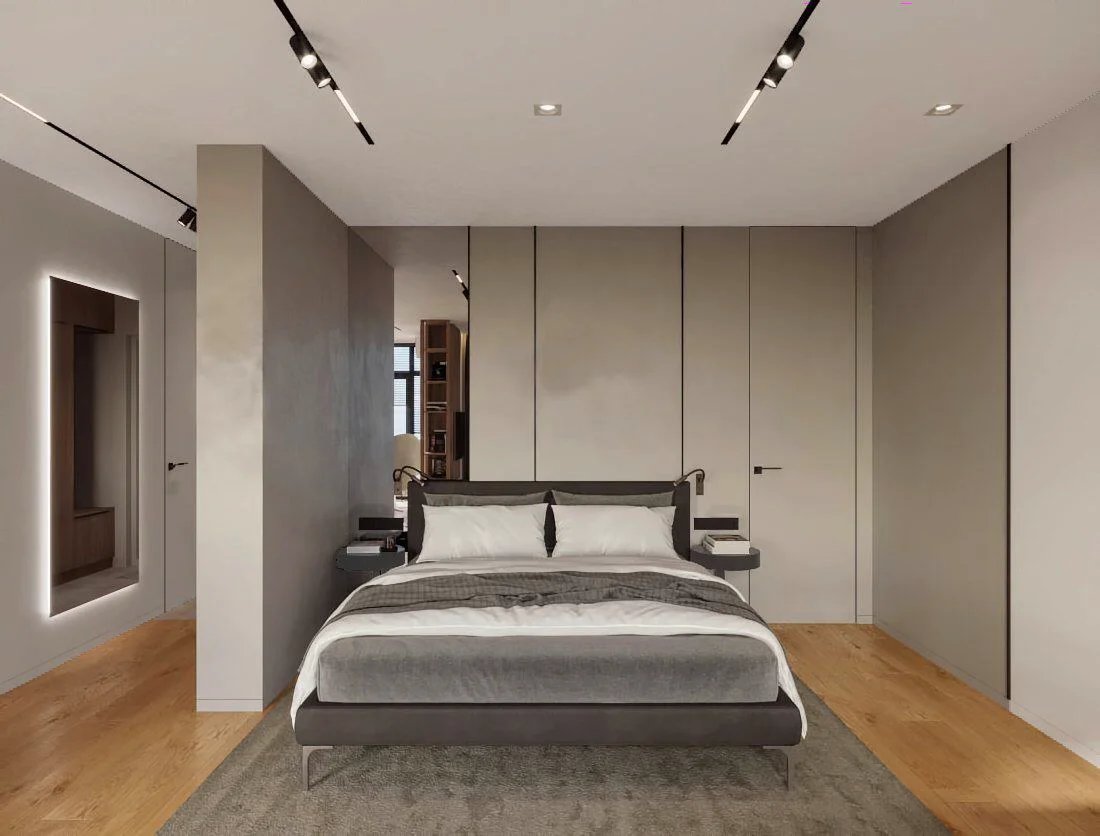 В интерьере доминируют нейтральные тона, такие как белый, бежевый и серый, что создает спокойную и гармоничную атмосферу.