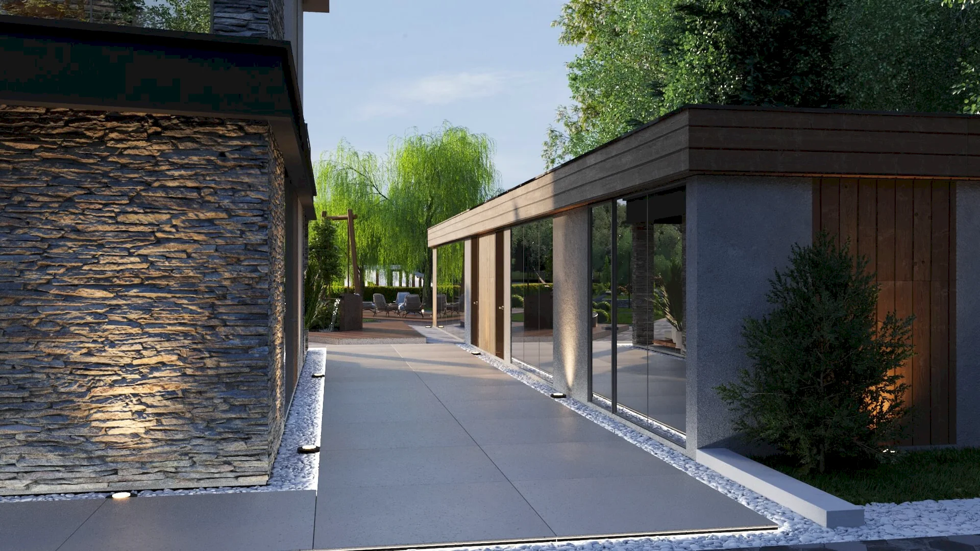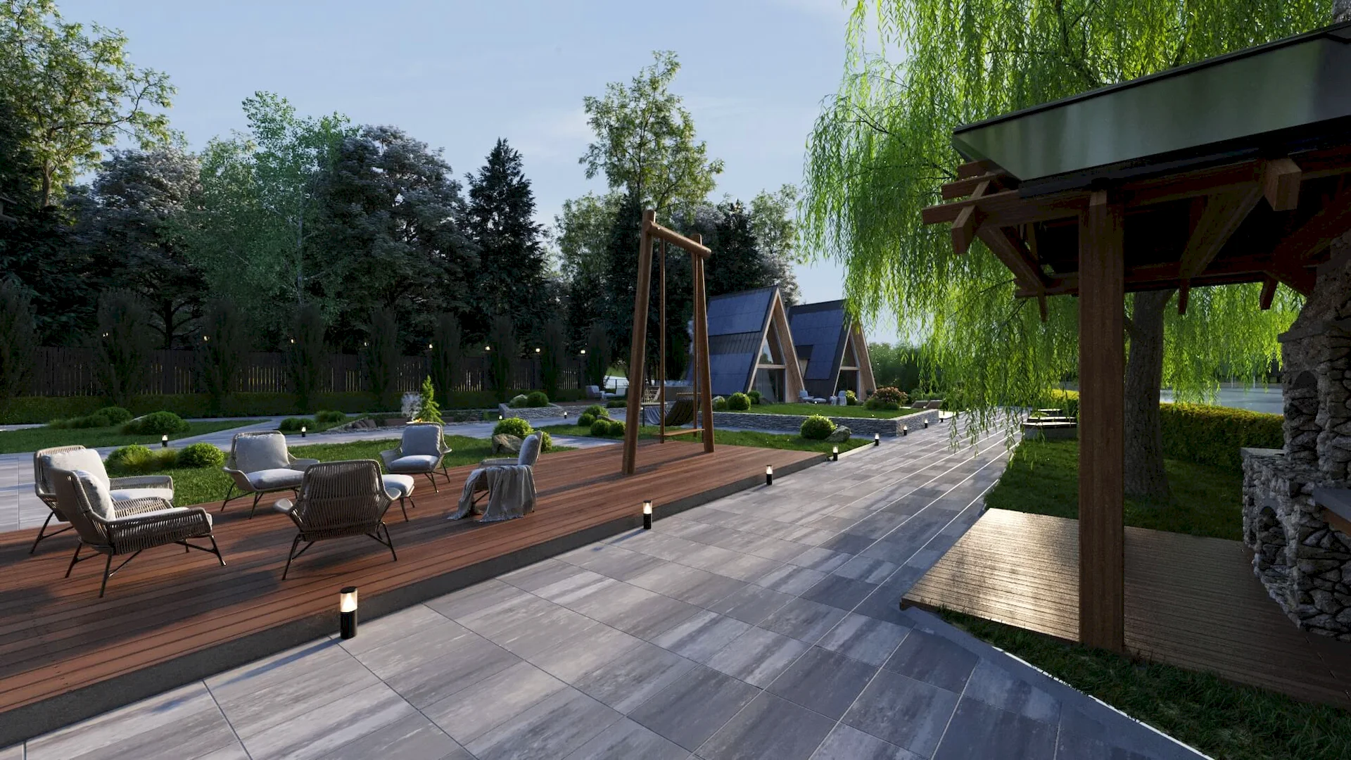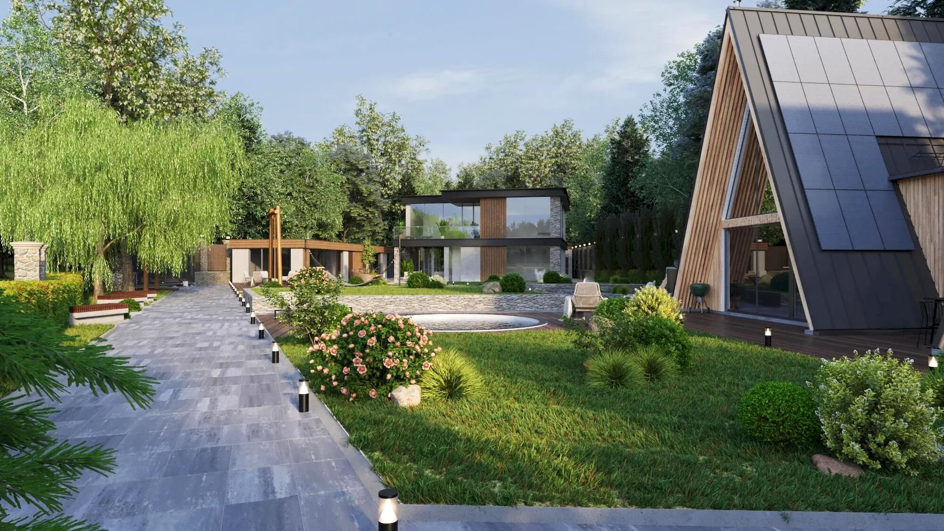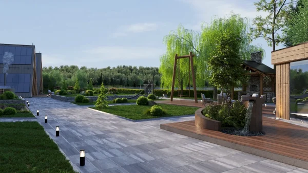 Разработка ландшафтного дизайна с большим количеством озеленения территории, большой современный дом с просторными балконами и террасой. Размещение 2 гостевых домиков и зимней террасой на большую компанию