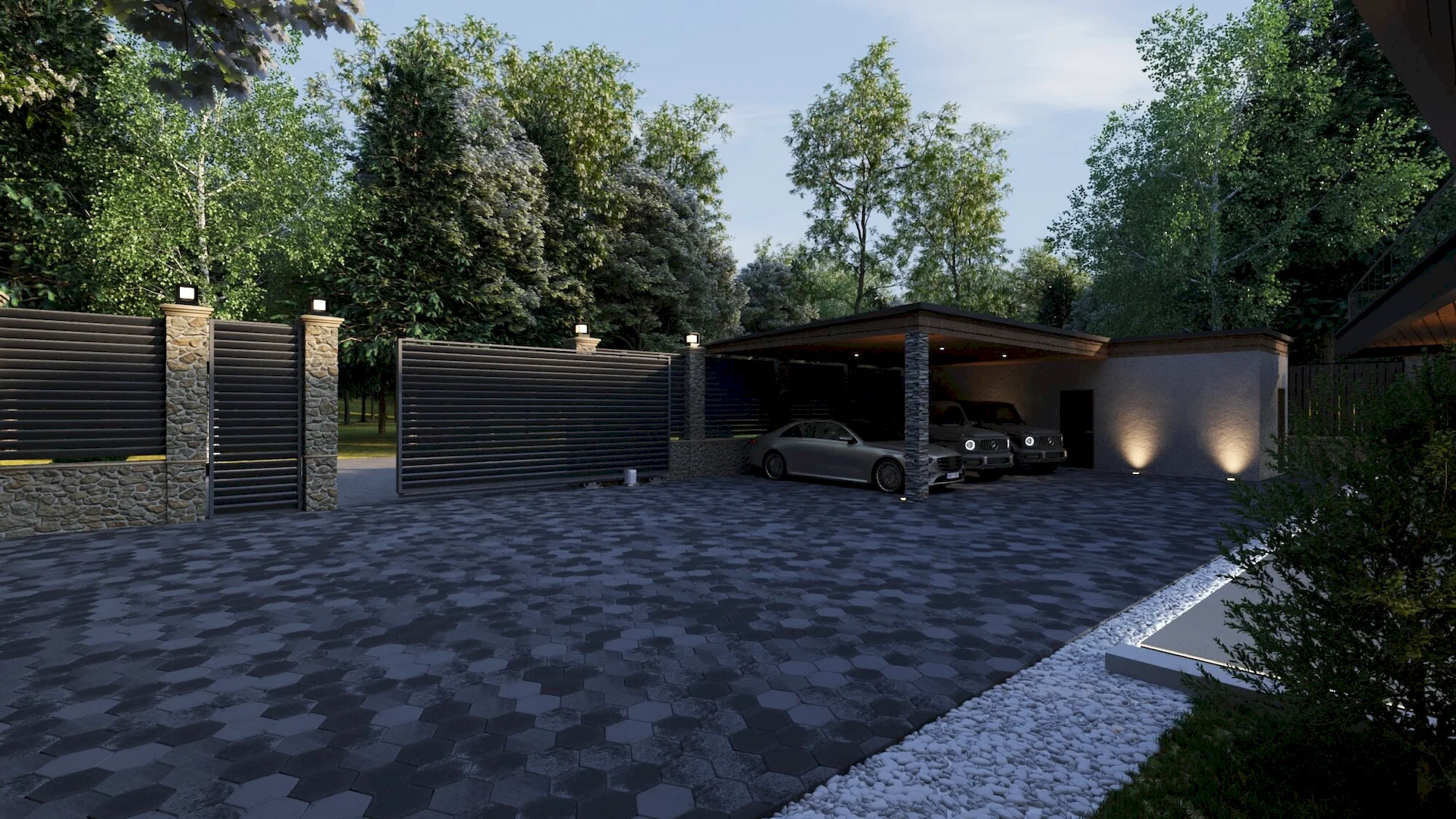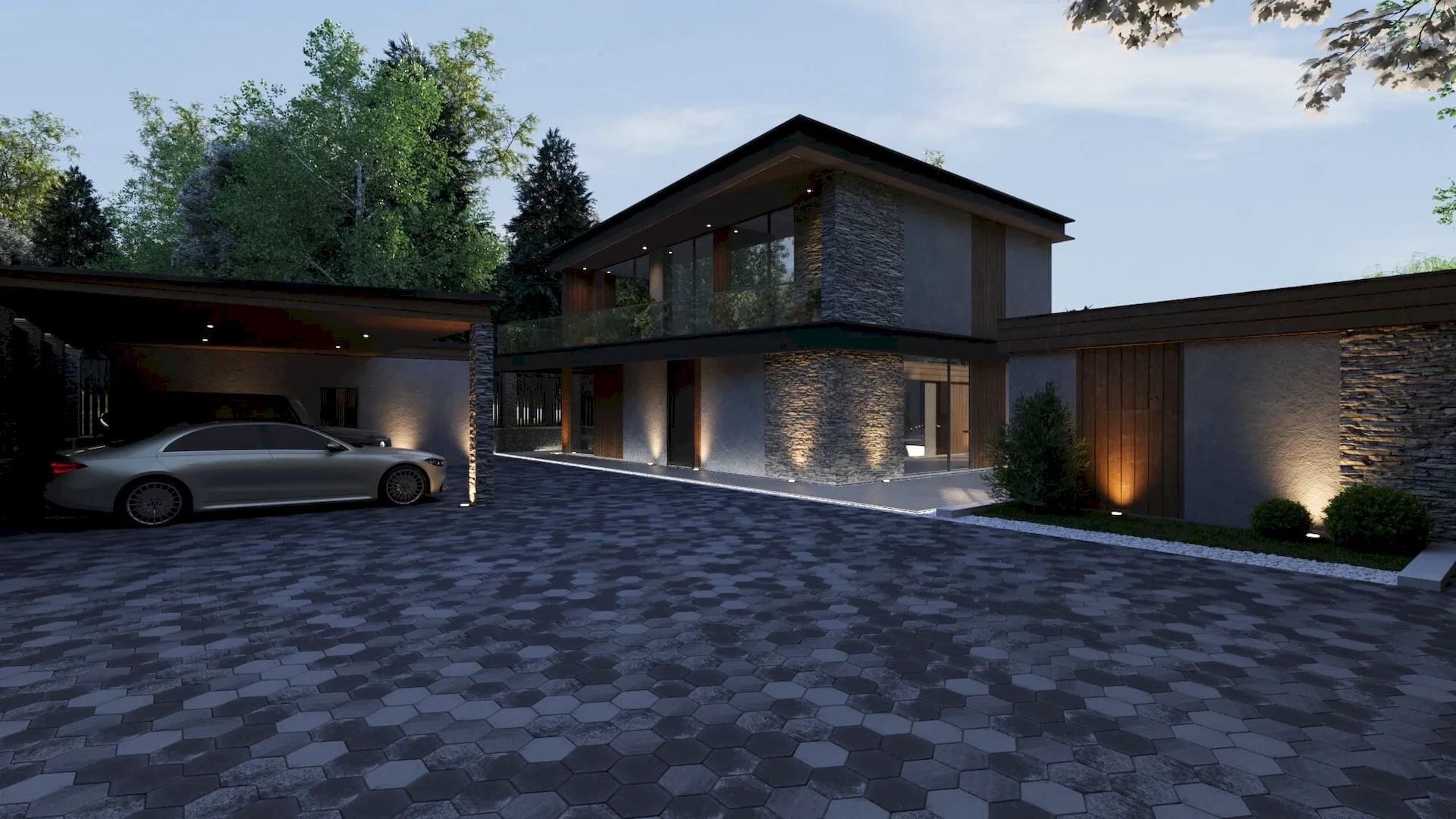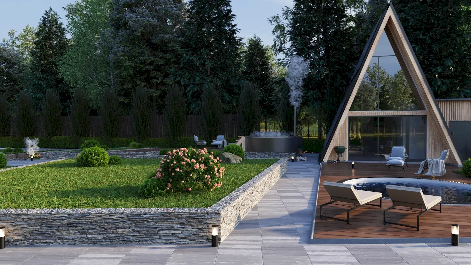 Разработка ландшафтного дизайна с большим количеством озеленения территории, большой современный дом с просторными балконами и террасой. Размещение 2 гостевых домиков и зимней террасой на большую компанию