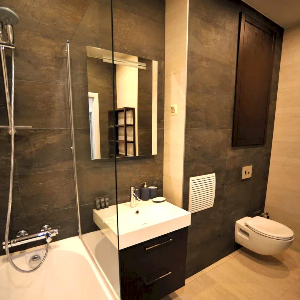 Ванная: Пространство для релаксации. Гладкие поверхности и минималистичный дизайн способствуют созданию спокойной атмосферы, подходящей для водных процедур.